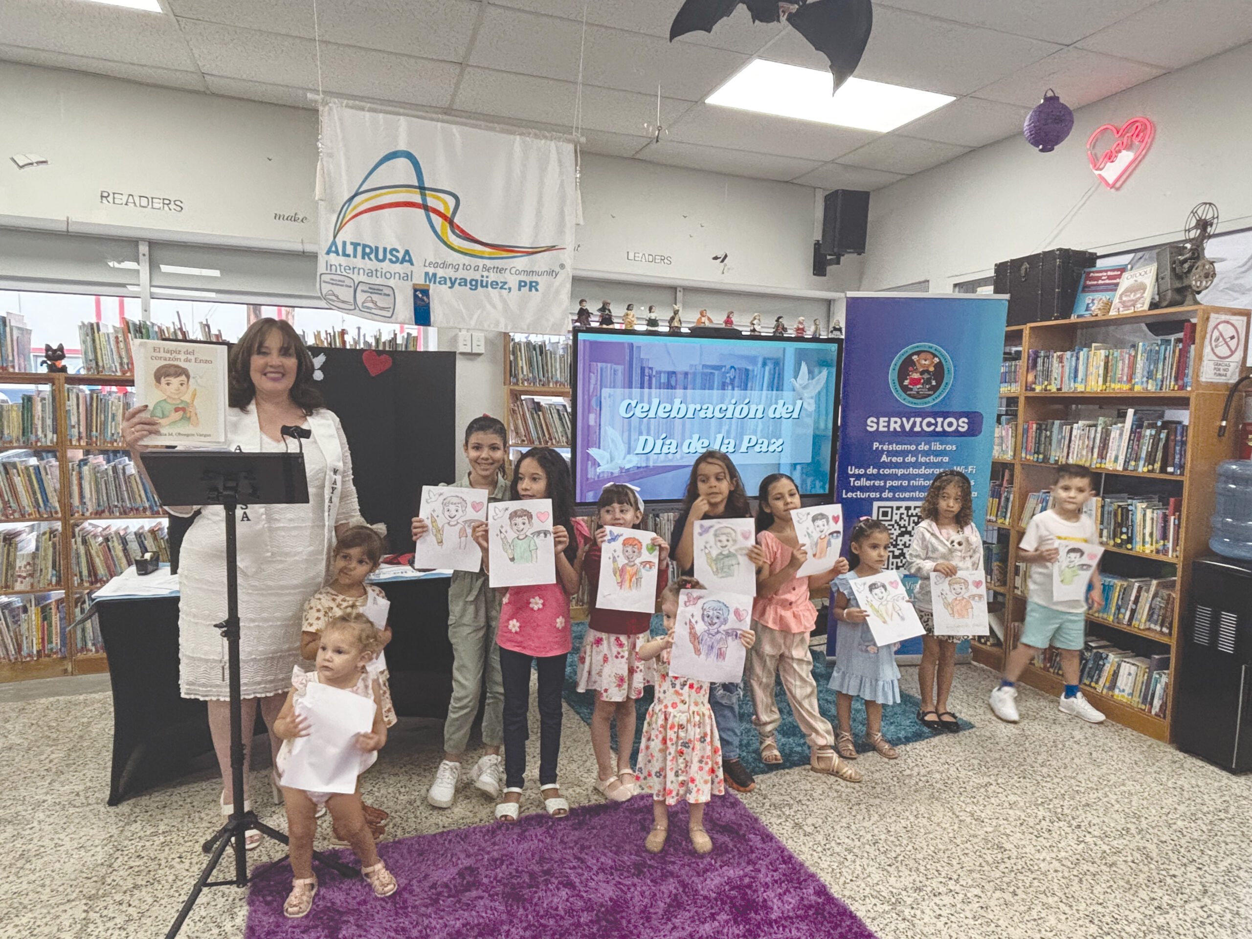 Las Altrusas Internacional de Mayagüez, bajo la presidencia de Minerva Flores y con el apoyo del Comité de la Paz, celebraron el 1 de noviembre el Día de la Paz. El evento se llevó a cabo en la Biblioteca Juvenil de Mayagüez, gracias a la colaboración de su administradora, Waleska Vargas Muñiz, y contó con la participación de un nutrido grupo de niños acompañados de sus familiares.