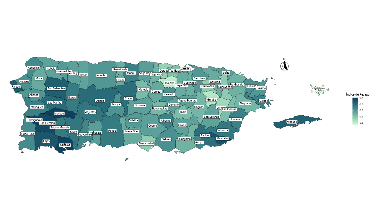 El análisis revela que 42 municipios mostraron una disminución en su puntuación del Índice de Rezago, lo que sugiere una mejoría relativa en las condiciones que mide el indicador. De estos, 22 municipios registraron una reducción mayor al 5%. De igual forma, se observan concentraciones de municipios con puntuaciones más altas —indicando mayor rezago relativo— en las regiones centro, sur, suroeste y sureste de Puerto Rico, mientras que varios municipios del área metropolitana y adyacentes reflejaron avances en comparación con el resto del archipiélago.
