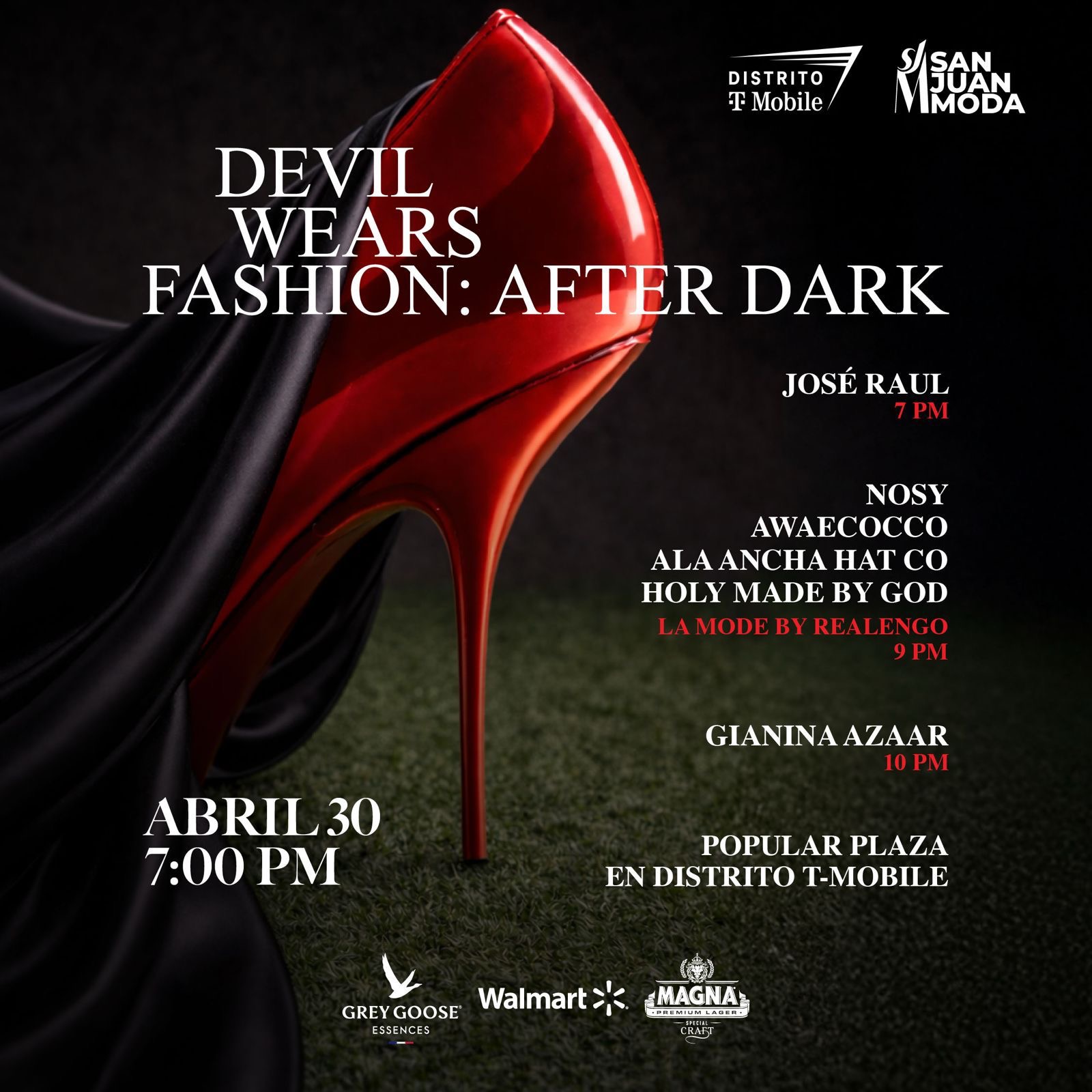 10:00 p.m. – Moda urbana y talento emergente, representando la fuerza de la street culture, con los desfiles de NOSY, AWAECOCO, ALA ANCHA HAT CO, HOLY MADE y BY GOD, en una producción de La Mode by Realengo, seguido del after party oficial.