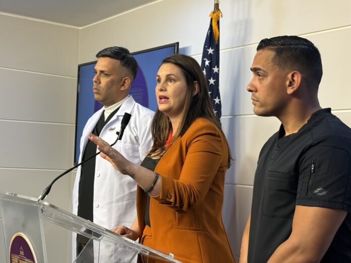 La Senadora fue acompañada por enfermeros como Juan Carlos del Valle y Anthony Sánchez, quienes han sido vocales sobre las condiciones laborales de los enfermeros y ambos trabajan por servicios profesionales sin derecho a plan médico.